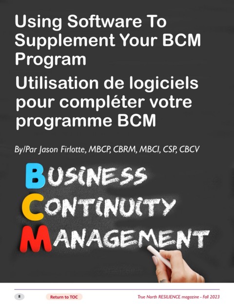 Using Software To Supplement Your BCM Program Utilisation de logiciels pour compléter votre programme BCM By/Par Jason Firlotte, MBCP, CBRM, MBCI, CSP, CBCV 8 Return to TOC True North RESILIENCE magazine - Fall 2023