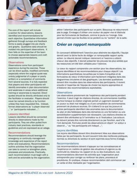 experience during the exercise. These Le coeur du rapport comprendra une section pour les observations, les